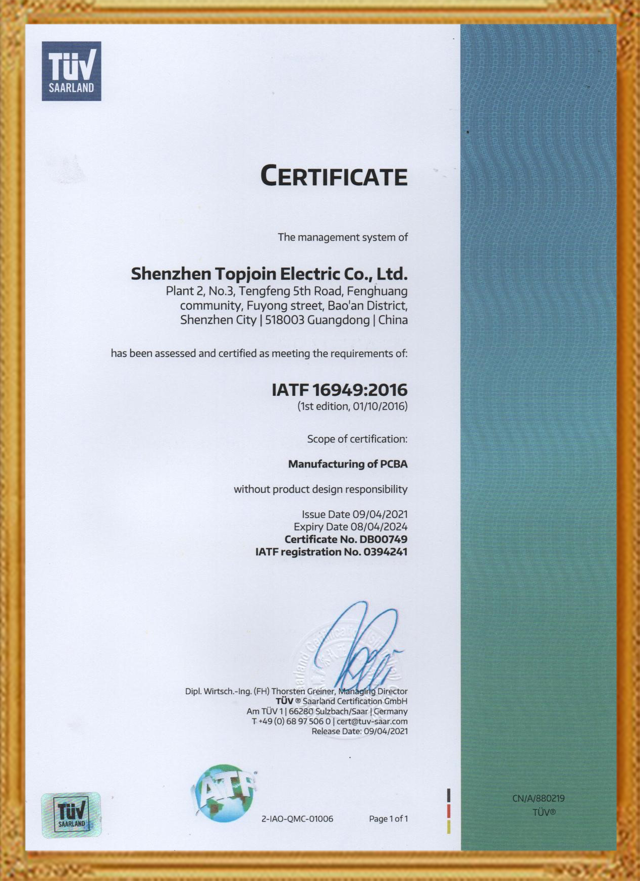 歐洲權(quán)威測試機(jī)構(gòu)專利證書
